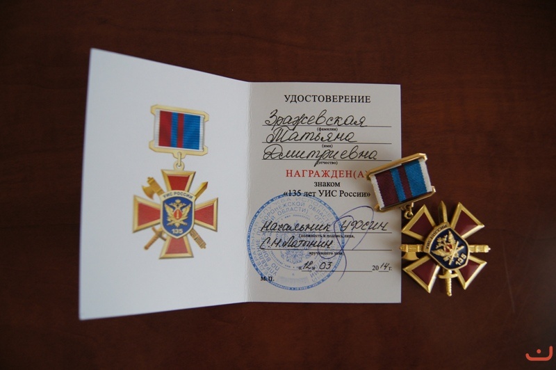 Татьяна Дмитриевна Зражевская была награждена знаком "135 лет УИС России" 25.07.14